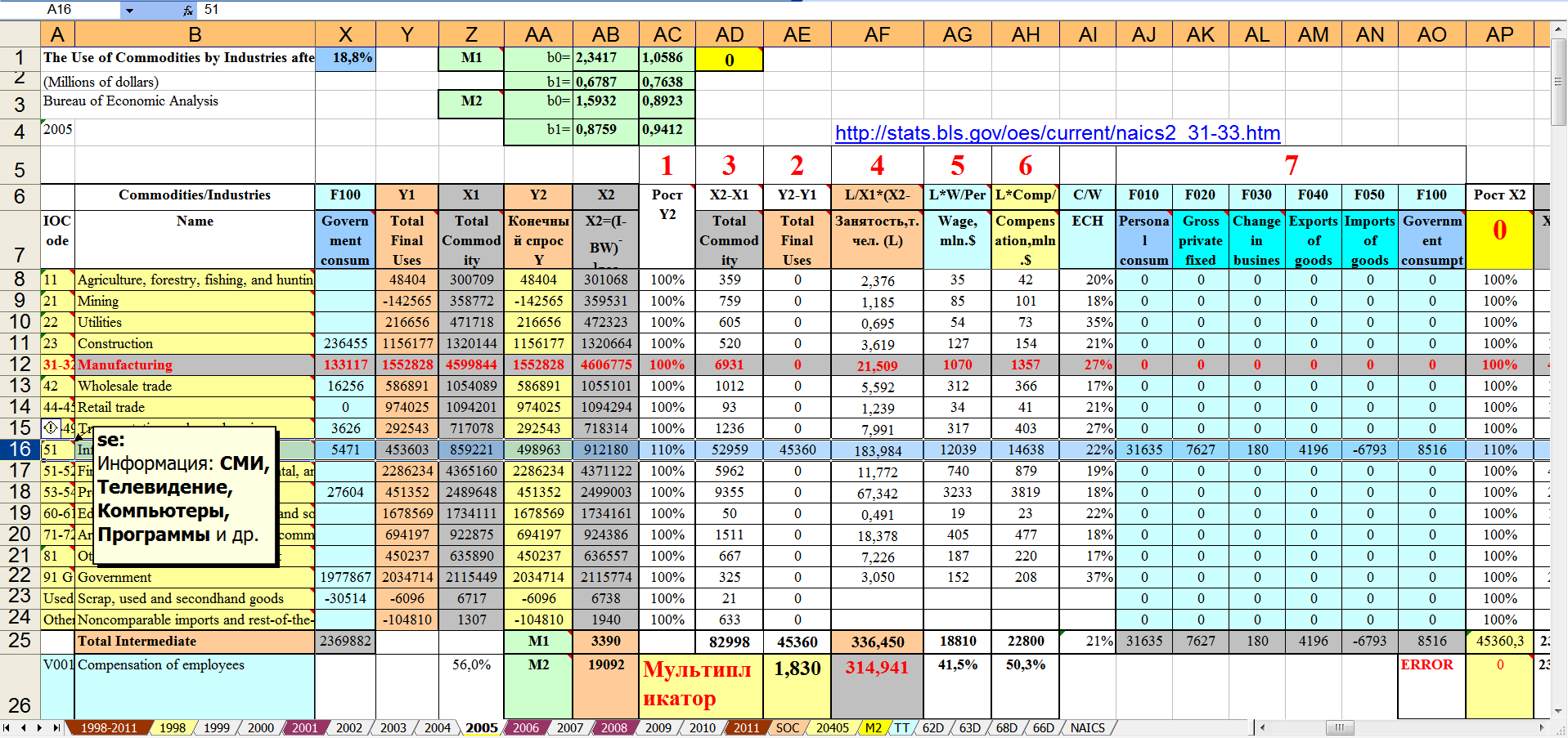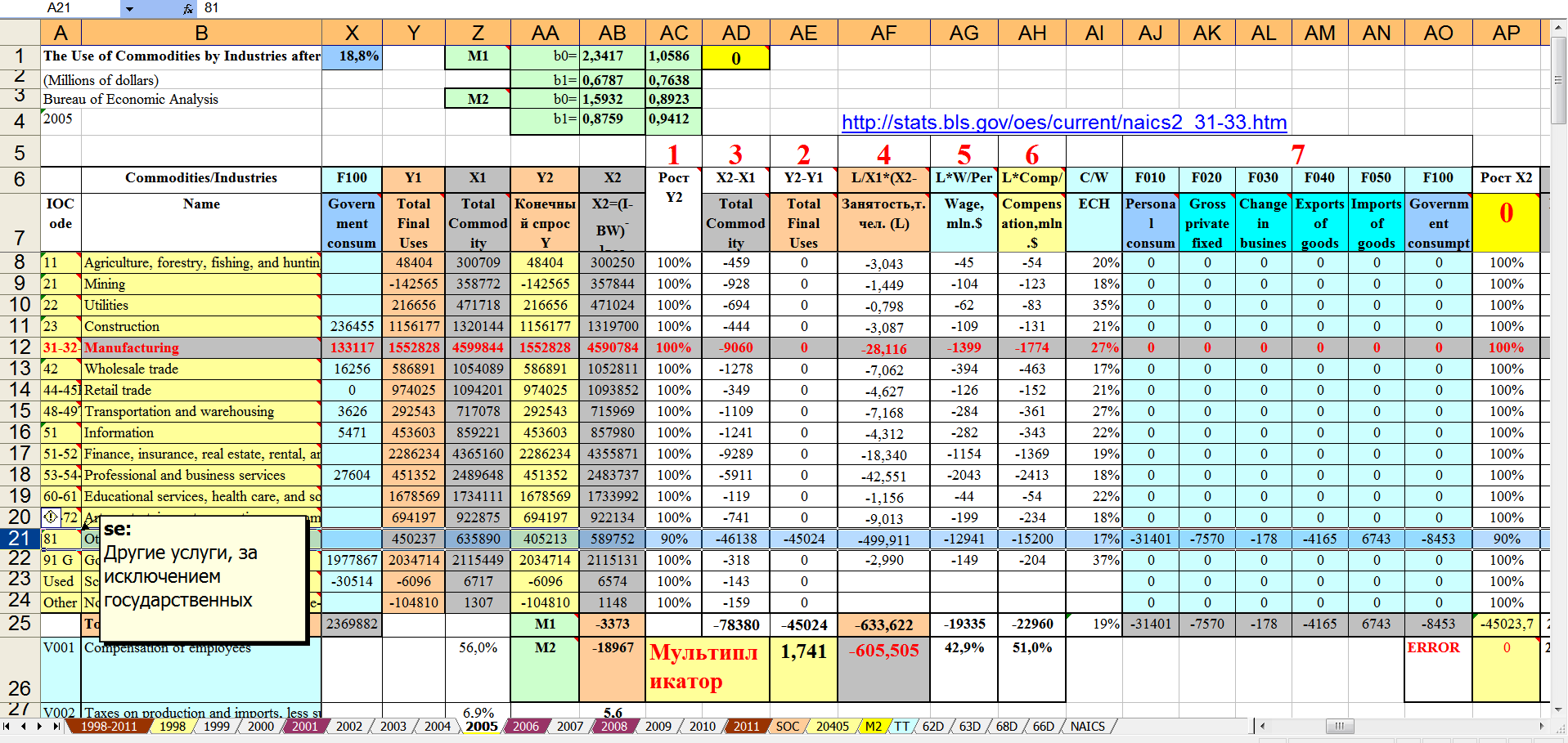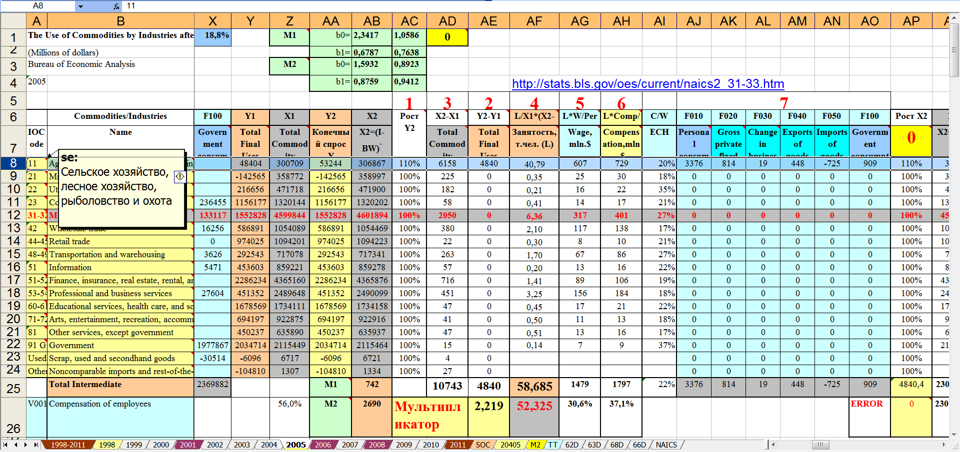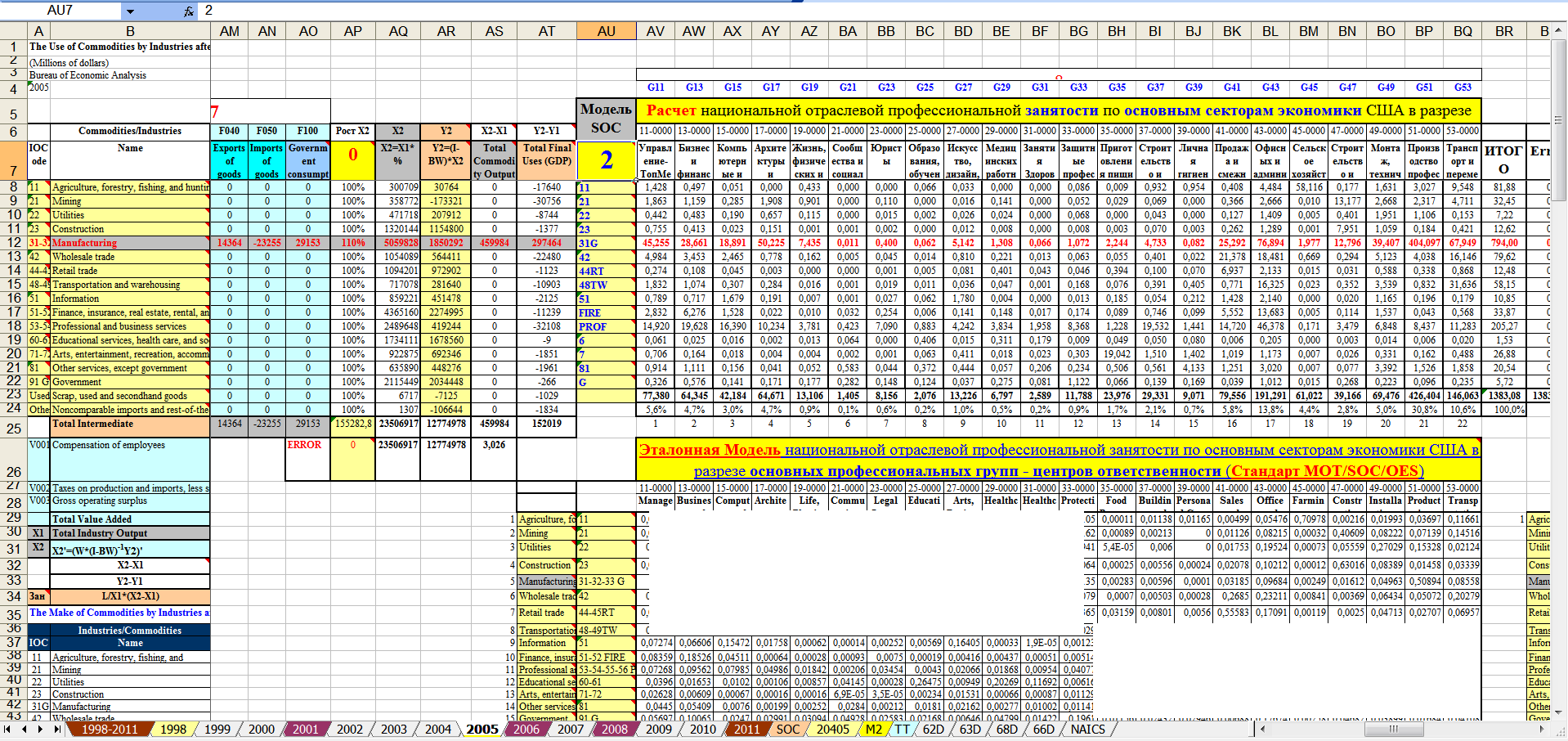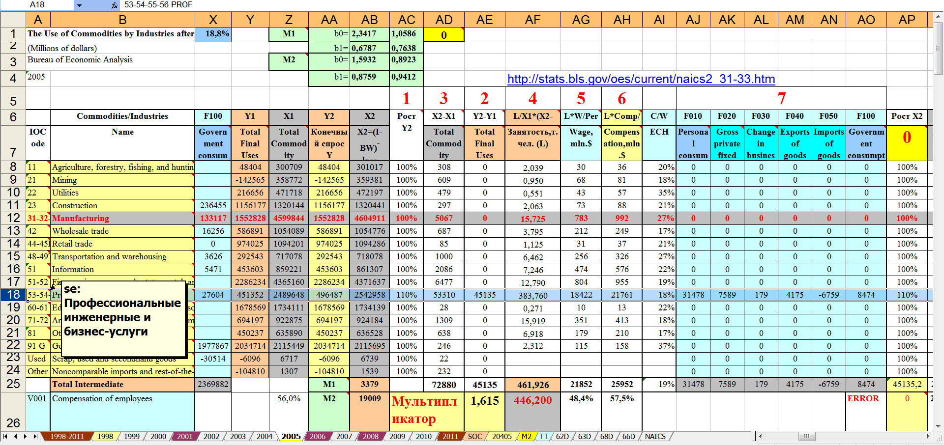 В рамках старого (действовал до 1998г.), промышленного стандарта США (SIC - Standard Industrial Classification), расчет велся для более 450 отраслей экономики США.