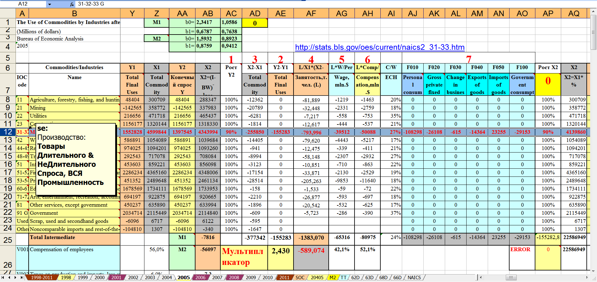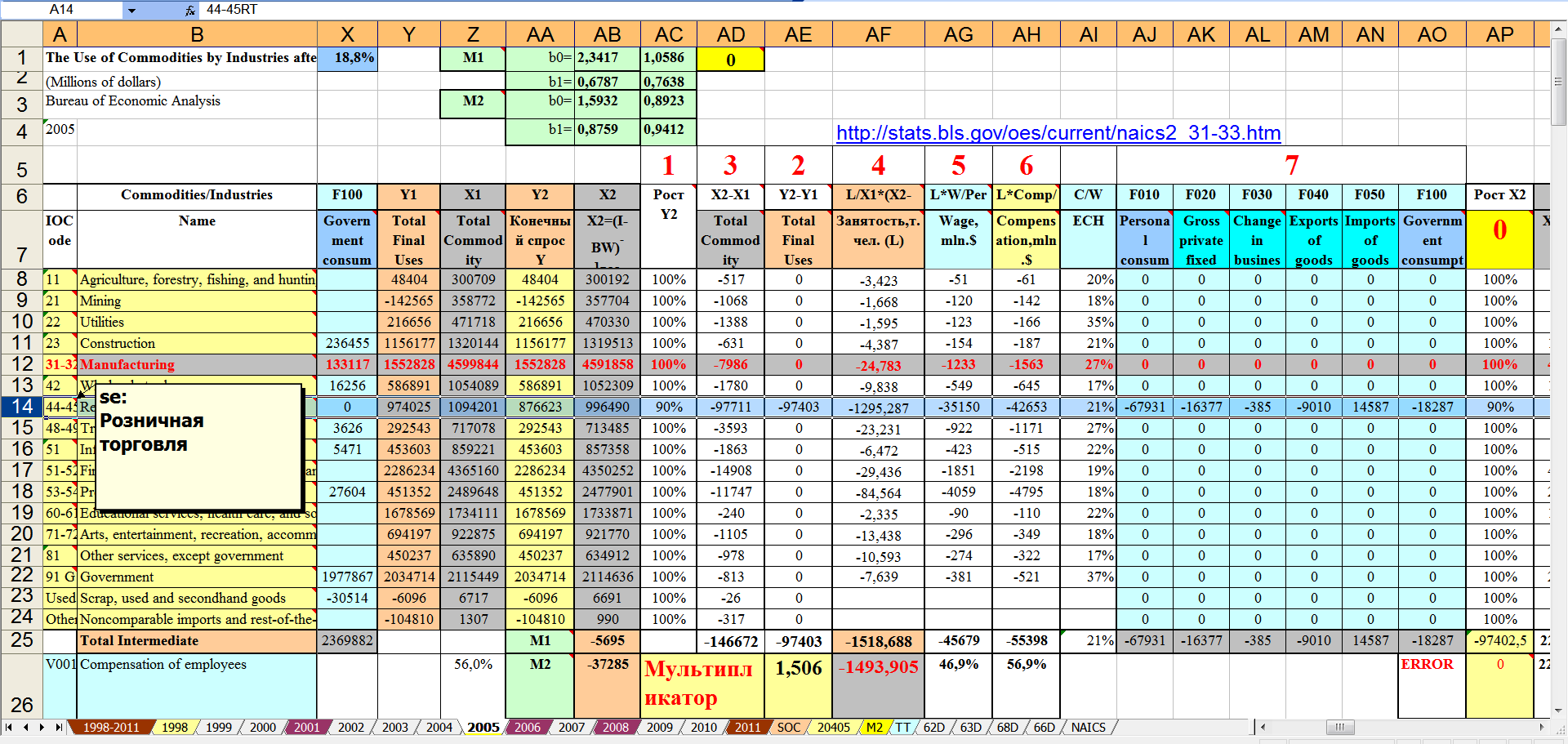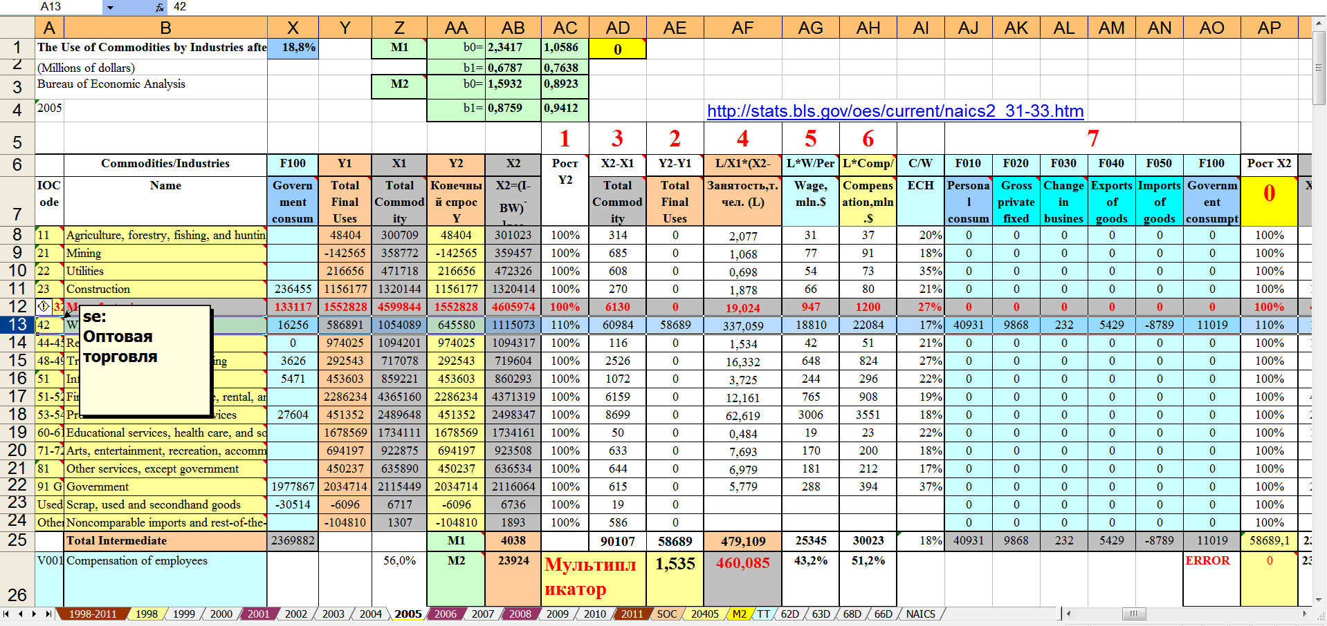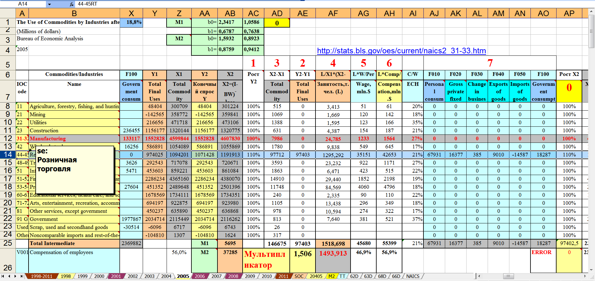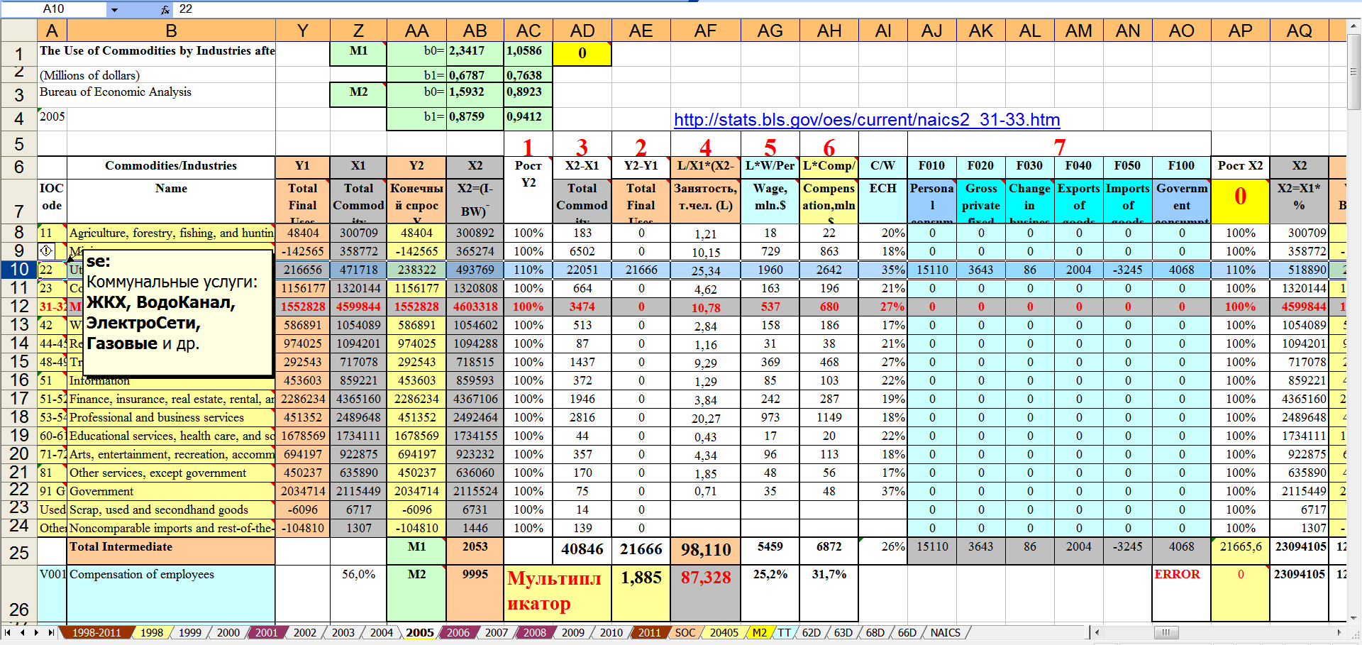 В рамках старого (действовал до 1998г.), промышленного стандарта США (SIC - Standard Industrial Classification), расчет велся для более 450 отраслей экономики США.