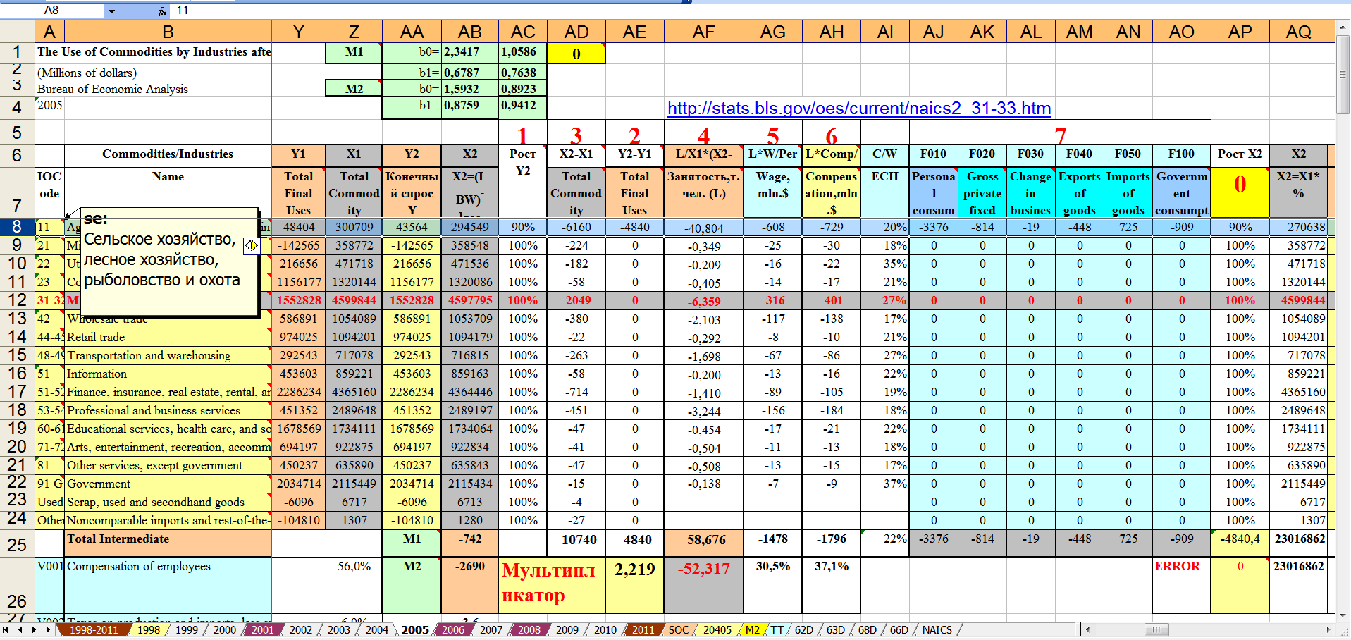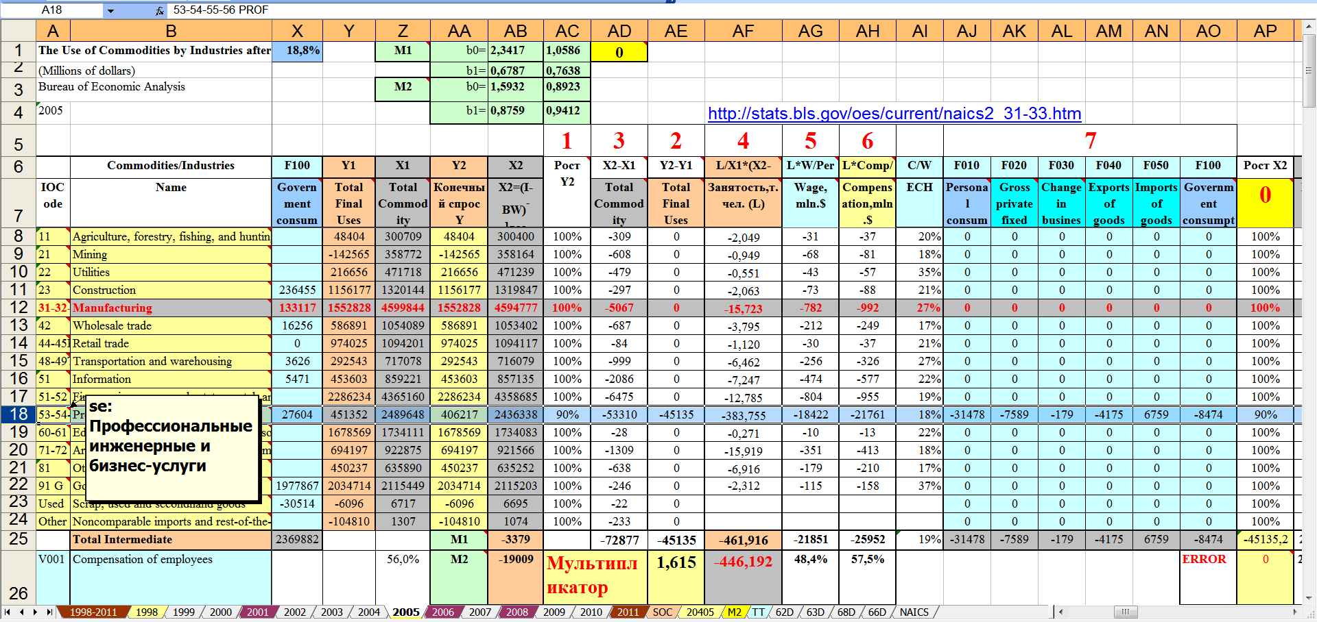 Уточним, что, для упрощения, в данном прогнозе исходный вектор Comp был определен на уровне 2006 г. Для корректного расчета необходимо было бы использовать вектор Comp (Table 6.2D. Compensation of Employees by Industry), вектор Per (Table 6.8D. Persons Engaged in Production by Industry) по каждой отрасли за 2007 г., но эти данные традиционно публикуются с опозданием в 8 месяцев (2/08/2008).