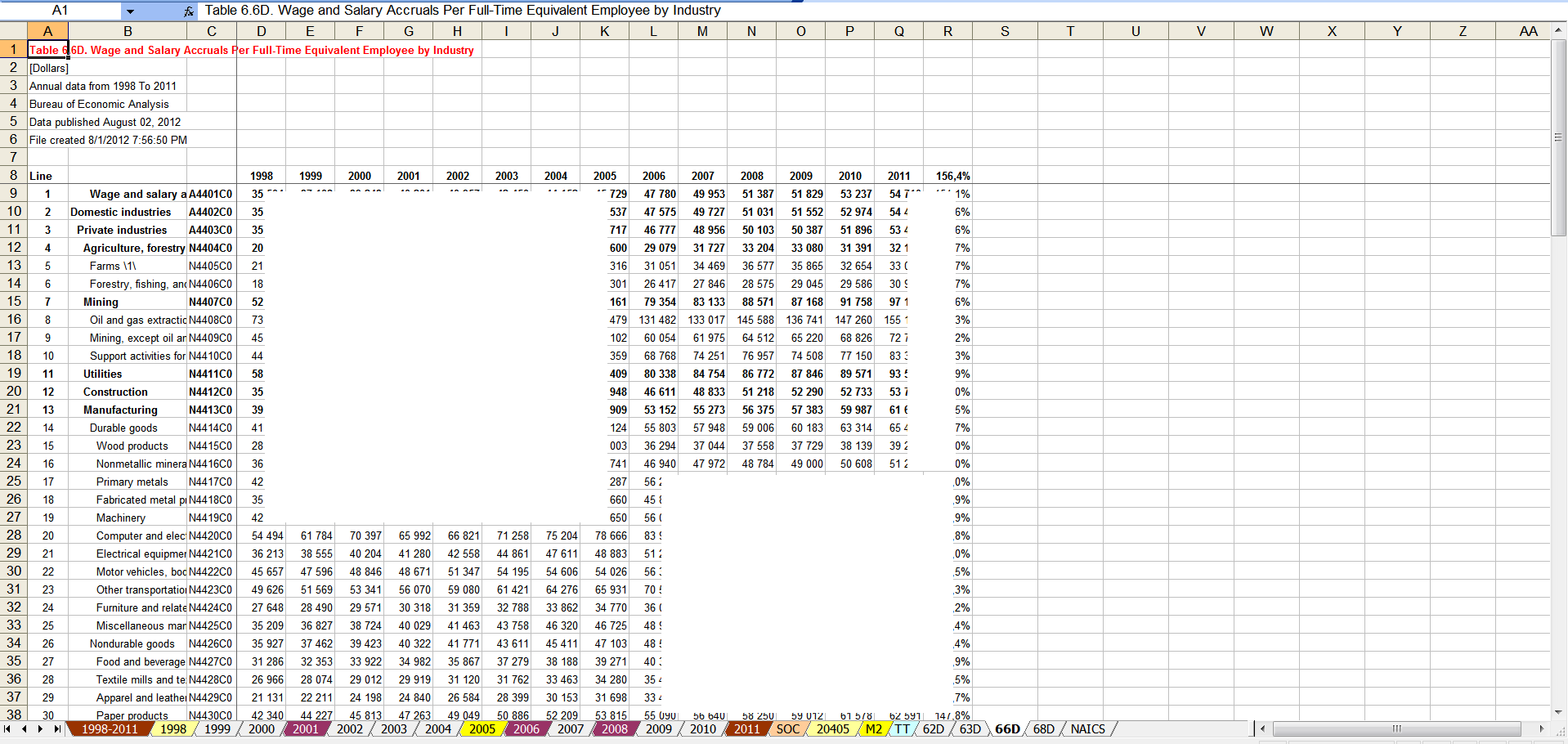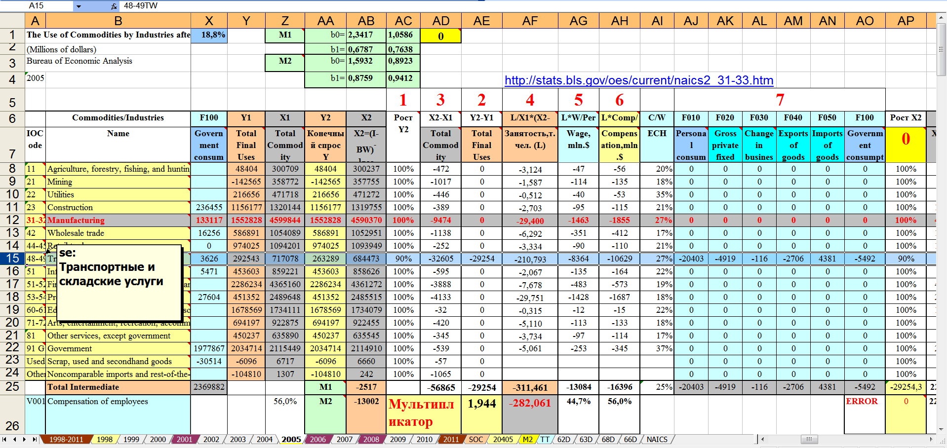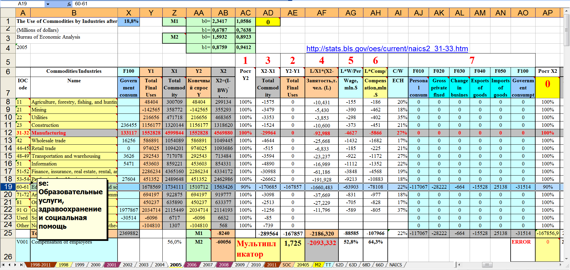 Для расчета изменения потерь по оплате труда (W - Wage) в экономике США в 2008-2009гг необходимо умножить вектор удельных прямых затрат труда L, в нашем случае роста безработицы на величину ЗП в каждой отрасли - вектор W (Table 6.3D. Wage and Salary Accruals by Industry) поделенный на вектор Per (Table 6.8D. Persons Engaged in Production by Industry). В векторной форме можно представить: