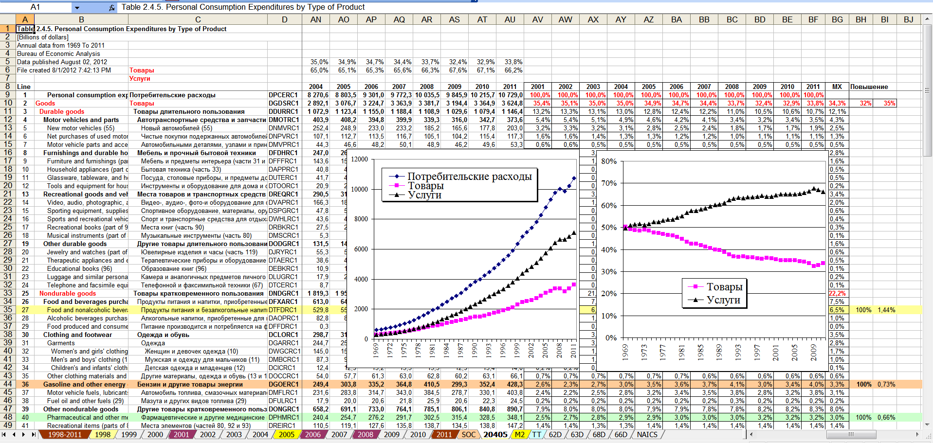 Рассмотрим таблицу "Ресурсы товаров и услуг" "The Make of Commodities by Industries (I-O definition)".