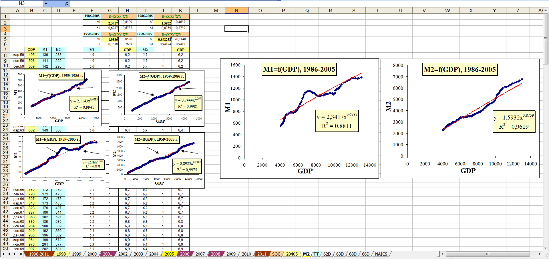 Для расчета изменения денежных агрегатов М1, М2 воспользуемся исследованиями О.Чадаева Динамика доли денежного агрегата М2, М1 (млрд.долл.США) по отношению к ВВП (GDP, млрд.долл.США) за период 1986-2005 г.г. в США составили см. рис.