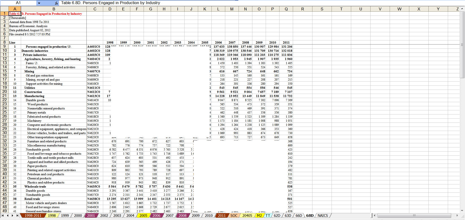 Для расчета роста/падения безработицы в экономике США в 2008-2009гг необходимо учесть данные по численности (Per - Persons) - берутся из Table 6.8D. Persons Engaged in Production by Industry и рассчитать удельные прямые затраты труда L (доля численности занятых - Persons Engaged в объеме продаж каждой отрасли), т.е. вектор L=Per/Х1 умножить на вектор прогнозируемого объема продаж в 2008-2009гг (Total Commodity Output (ТСО): ΔX=(X2-X1). Для получения вектора изменения затрат труда ΔL в каждой отрасли этого достаточно умножить вектор удельных затрат труда L в каждой отрасли на вектор прогнозируемых изменений валового выпуска ΔХ для каждой отрасли: